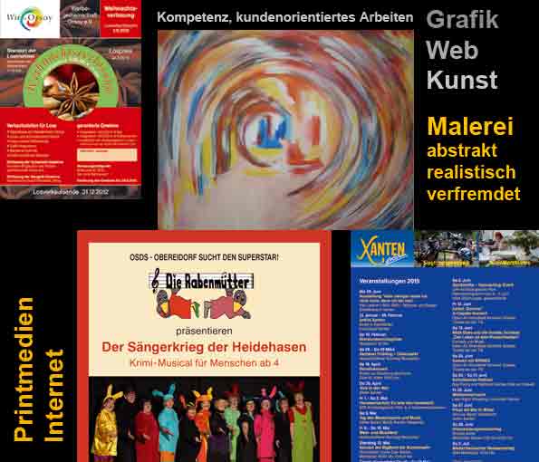 Die Erstellung der Arbeiten erfolgt per E-Mail, Telefon und in Nachbarstädten auch per Kundenbesuch. 0 28 02 -- 948 23 53 kontakt@grafik-web-kunst.de